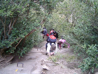 Superem la roca per la dreta i trobem un primer passamà de ferro i una palanca metàl-lica, que no suposa cap perill (8). Aquí és troba un camí a la dreta que ressegueix la carena (el farem de tornada), hem de anar a l’esquerra i passar per sobre el “Barret”, el camí busca l’inici de la canal entre un bosc de boixos.